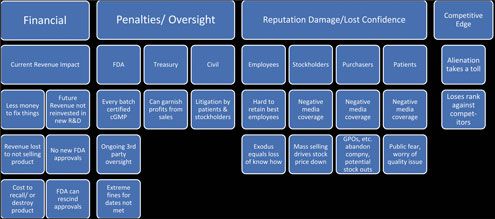 FDA does not care about any efforts and expenses undertaken by the company to redesign and implement a robust quality management system; a common element of a consent decree is demonstrating sustainability. A company under consent decree who doesn’t demonstrate sustainability can lose future revenue in different ways. One way, which is particularly difficult to quantitate, is the price of “lost innovation”. The company is redirecting revenue into compliance, oversight, and remediation instead of reinvesting it into research and development of new products.